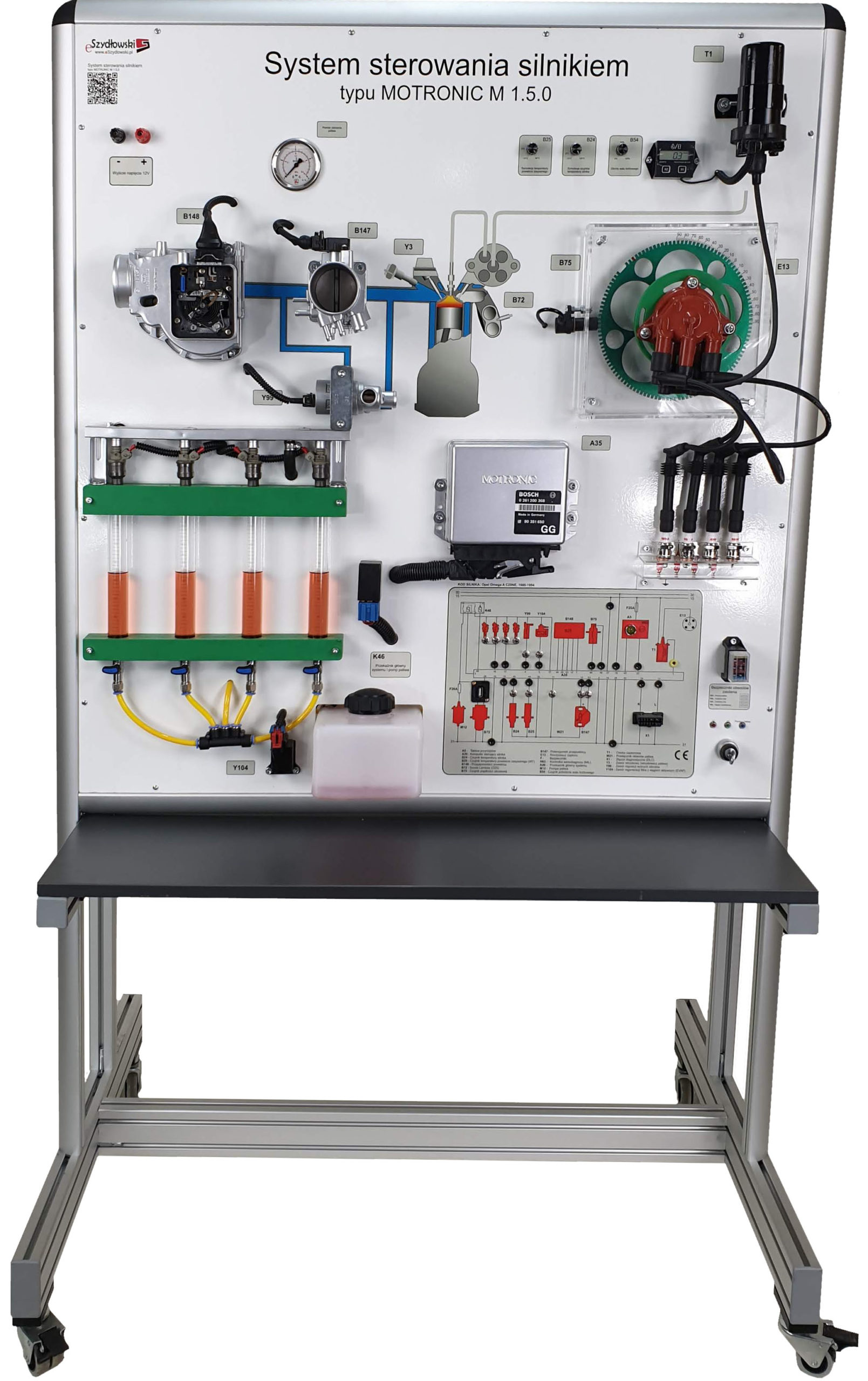 Stanowisko przeznaczone do zademonstrowania funkcjonowania systemu sterowania pracą silnika w zakresie kąta wyprzedzania zapłonu, zmiany dawki paliwa zależnej od czujników zewnętrznych systemu, prędkości obrotowej, obciążenia. Układ umożliwia poznanie zasad działania i metod diagnostycznych, mających zastosowanie w diagnostyce pojazdów wyposażonych w układ napędowy z silnikiem z zapłonem iskrowym działającym w systemie zintegrowanego wtrysku typu Motronic M 1.5.0