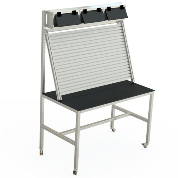 - Stół wyposażony w 3 szafki umieszczone wzdłuż górnej krawędzi stołu o wymiarach 400x200x120 mm każda