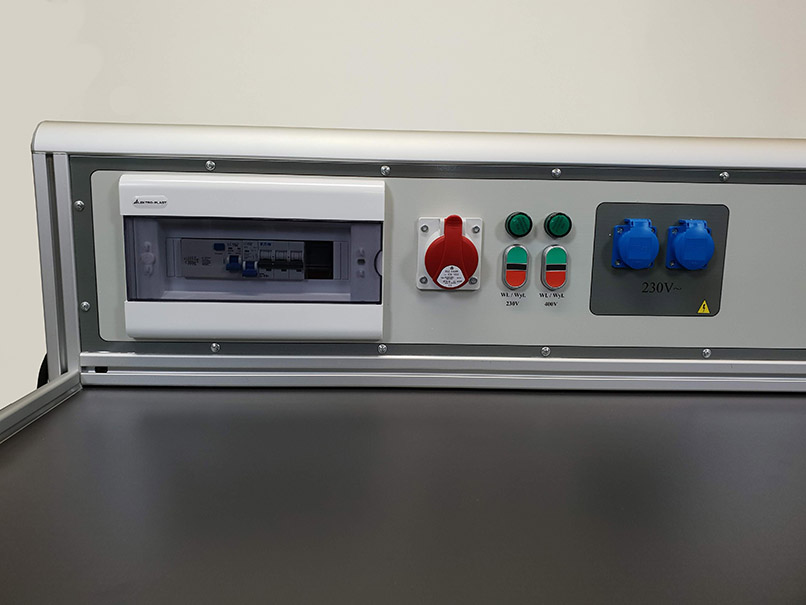 Stół elektrotechniczny ALU-N25 400-Z, w całości wykonany z profili aluminiowych łączonych mechanicznie o przekroju 40x40mm, lewa tylna noga stołu wyposażona standardowo w korytko do przeprowadzania przewodów sygnałowych i elektrycznych o przekroju 40x80mm.