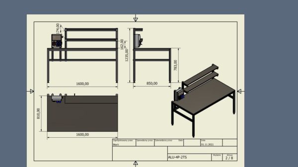 - Stół elektrotechniczny, konstrukcja wykonana w całości z profili aluminiowych anodowanych o przekroju 40x40mm. Profile wyposażone w rowki konstrukcyjne o szerokości 8 mm oraz głębokości 12,25 mm dodatkowo profil posiada otwór rdzeniowy. Wymiary blatu roboczego 1600×810. Stół wyposażony w stopki poziomujące o zakresie regulacji 4cm. Wysokość robocza blatu wynosi 748 mm (bez stopek).