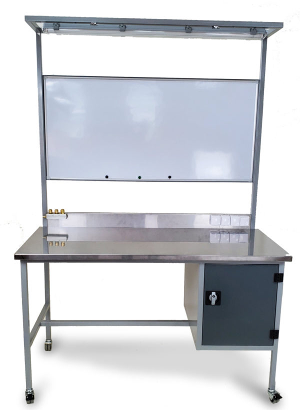Stół warsztatowy WR-1500T02 posiada nogi wykonane z profili stalowych o grubości 2.0 mm, Blat stołu odporny na zarysowania i wysoką temperaturę oraz środki chemiczne wykonany ze sklejki 30mm oraz pokryty blachą kwasoodporną wygiętą w sposób umożliwiający zabezpieczenie góry, boków i dołu blatu. Stół Stabilny o obciążeniu 1000 kG. Wyposażony w pionową ramę do której przymocowano tablice magnetyczną. Stół warsztatowy WR-1500T02 zasilany jest napięciem przemiennym jednofazowym 230V / 50hz. Stół posiada 3 gniazda 230V, jeden włącznik służący do zapalania lampy LED. Wyposażenie stołu WR-1500T02 stanowi rozdzielacz pneumatyczny 1×3. Cała konstrukcja mobilna wyposażona w koła skrętne przednie oraz koła skrętne tylne z hamulcem. Po prawej stronie stołu znajduje się szafka na narzędzia zamykana na kluczyk zamkiem typu RONIS.